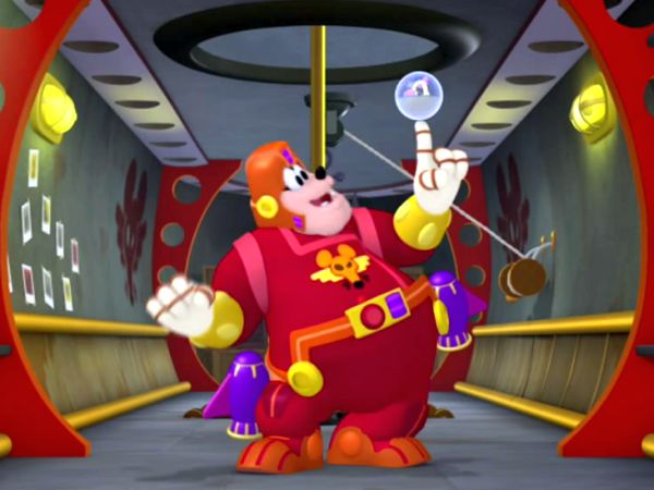 GOOFY: We better super hurry if we want to stop Power Pants Pete MICKEY MOUSE: Goof's right. Come on! Up and away. Let's save the day! PETE [singing]: